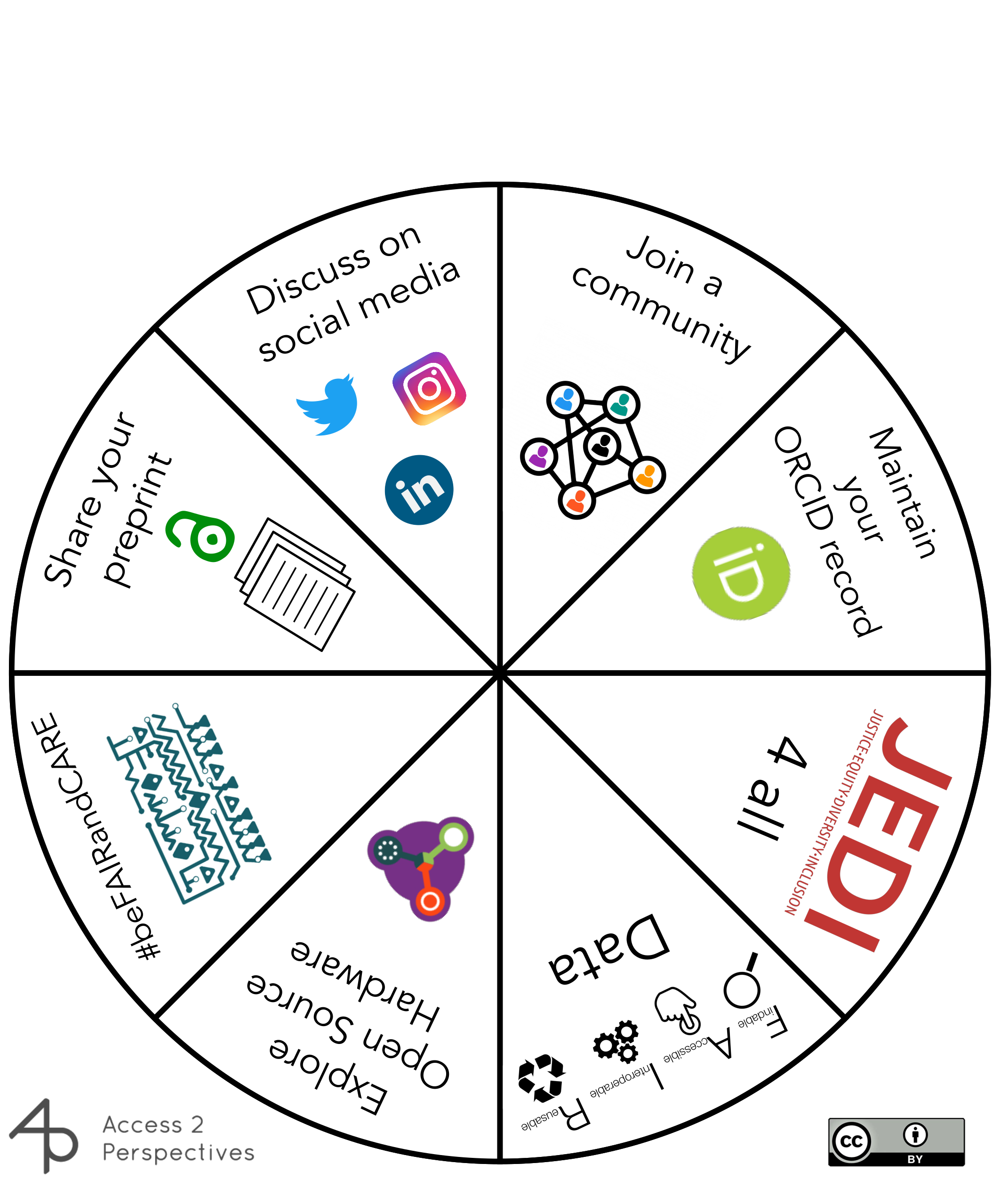 The Open Science Pie visualizes eight (8) important pieces of Open Science that can easily be implemented by any researcher to foster transparent, reproducible, and efficient research practices.